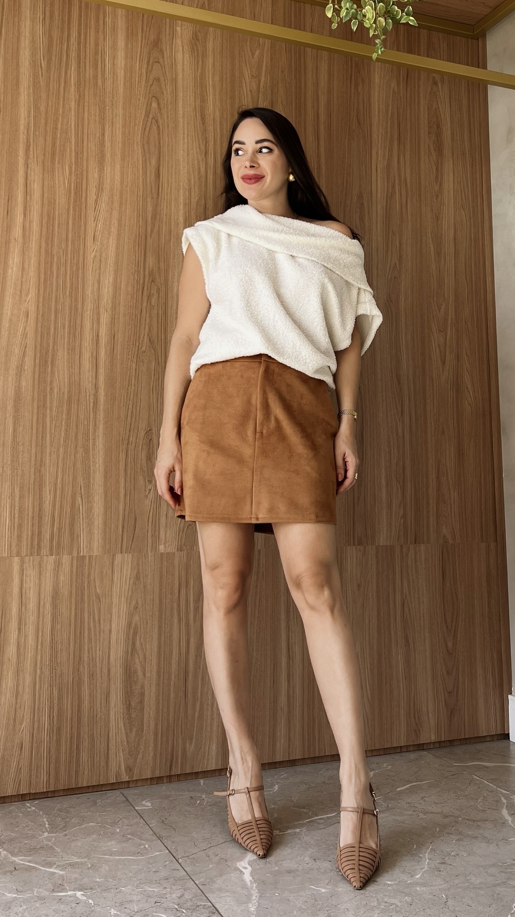 Saia curta em suede na cor canela, uma clássica da estação. Possui cós com fechamento em botão e zíper, proporcionando um ajuste seguro.